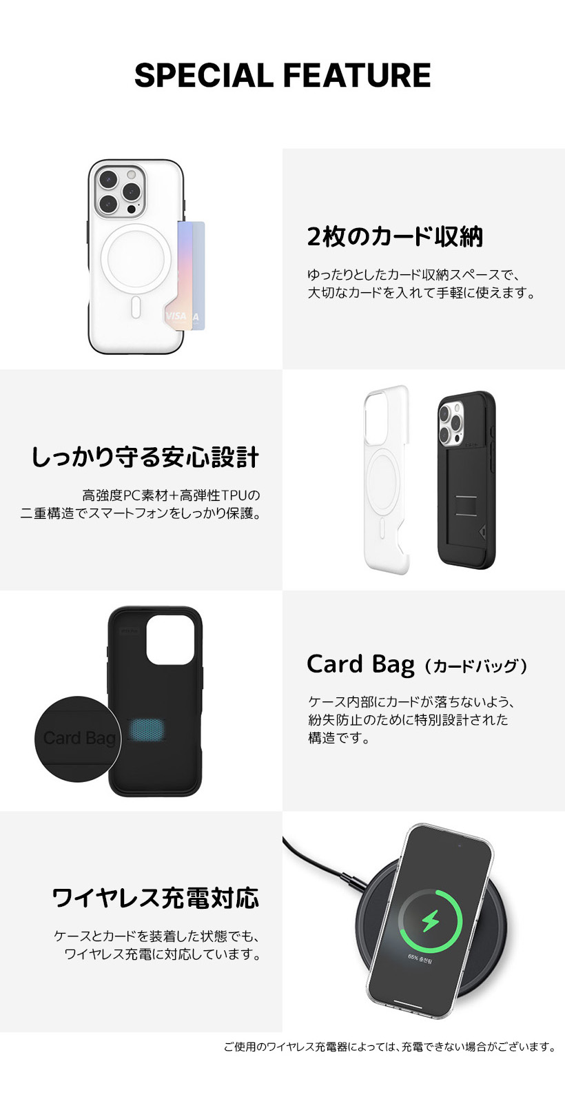 ケースを装着した状態でワイヤレス充電を行うと、接続が不安定になったり、充電速度が低下することがございます。